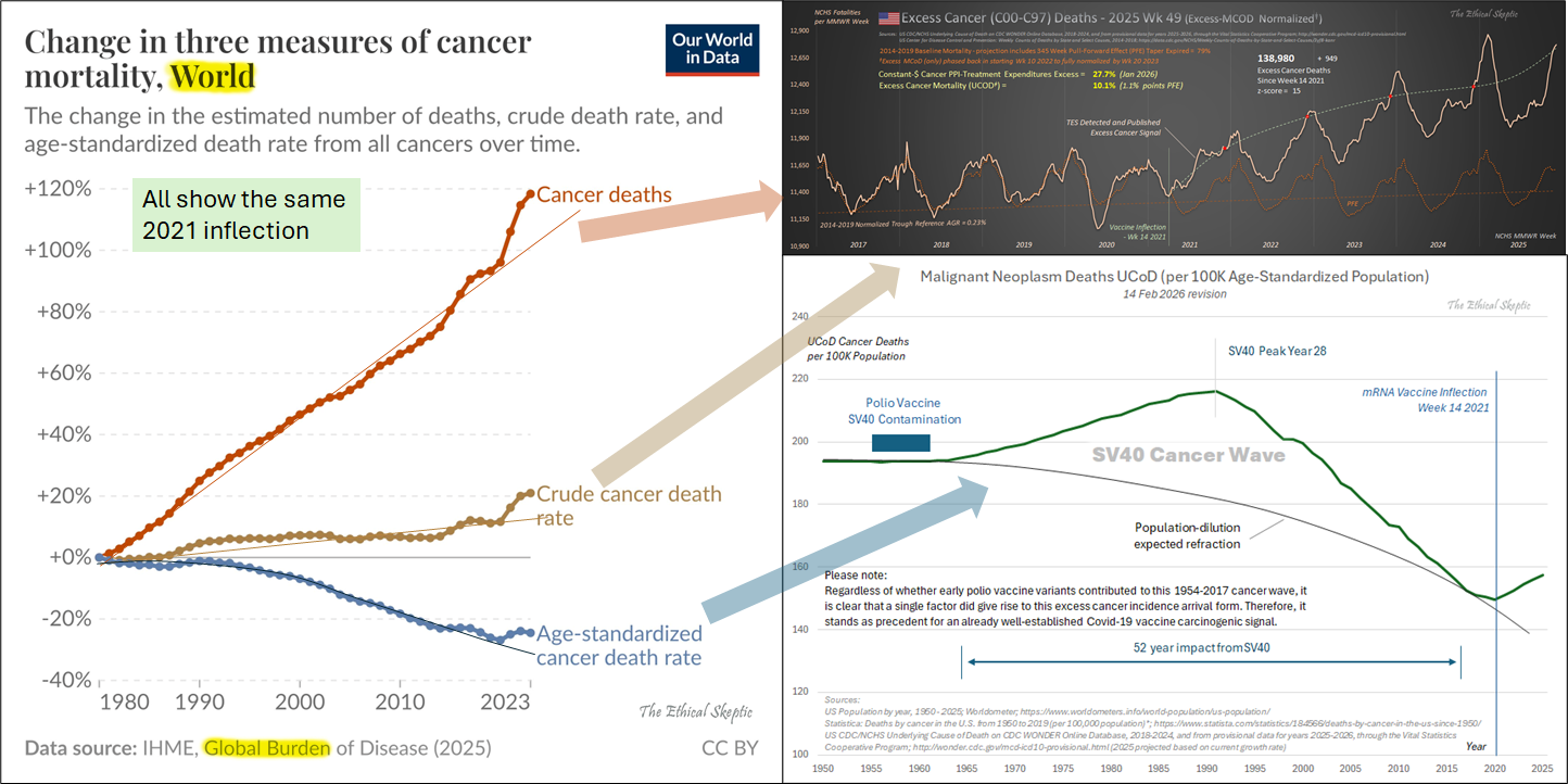Here we provide a link to a clear example of these techniques in action to make the entire pandemic statistically disappear. If one can make the entire pandemic disappear through these data tricks, they can certainly deceive the public into believing that no rise in cancer exists as well. Such elicits a key principle to grasp here: there is no data available which refutes this comprehensive analysis. One can hide the signal through bad technique or extreme single-use constraint (works with one graph but produces incoherence in others). But they cannot refute it through equivalent systemic corroboration or better data. Trained professionals understand why this litmus is important. A false modus tollens is the signal of a corrupt argument.
