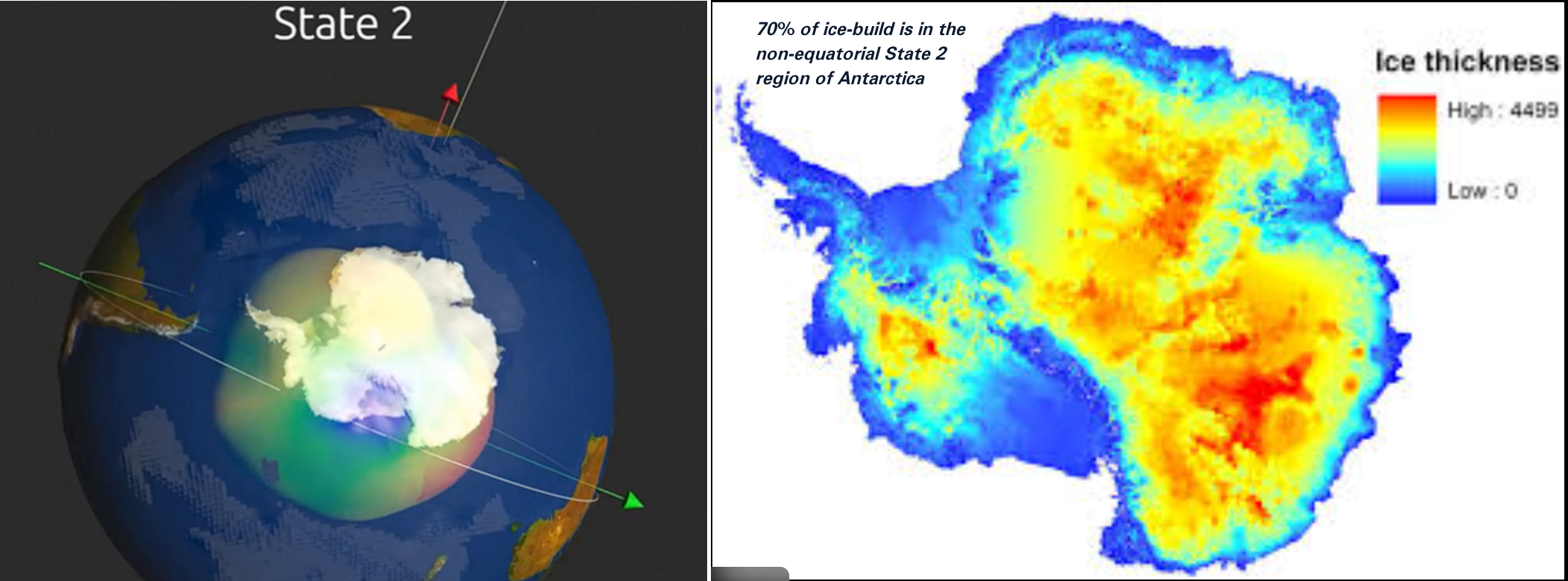 32. ECDO Theory predicts a much heavier ice concentration in East versus West Antarctica, based upon the continent’s positioning relative to the State 2 equator. Indeed, we find 70% of Antarctic ice to be positioned in East Antarctica, away from the State 2 equator.