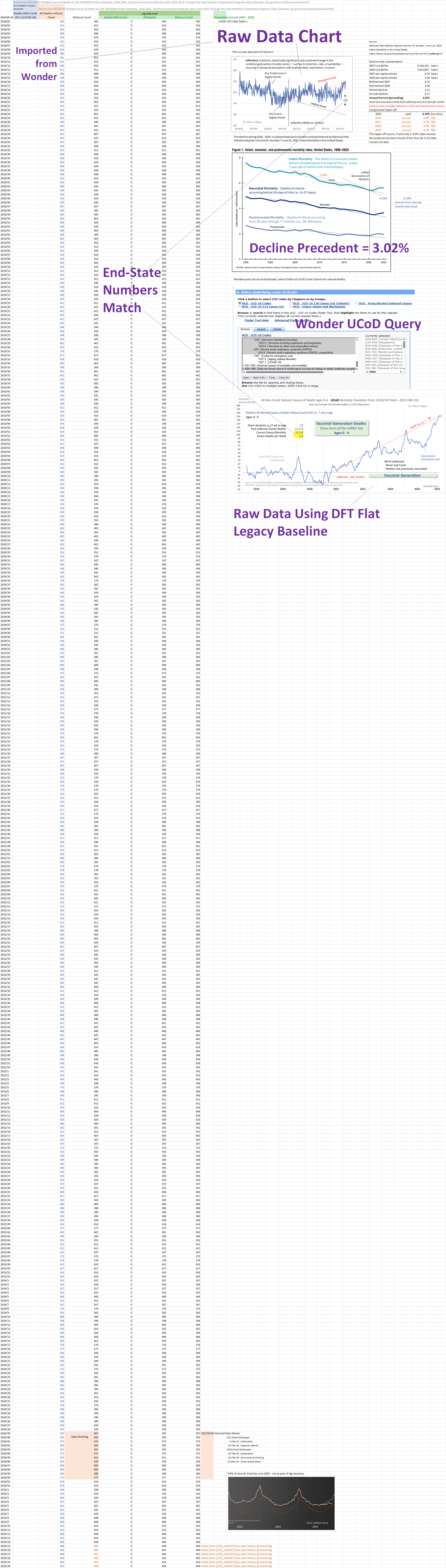 The employed Wonder UCoD query exclusion across all natural causes of death is shown in this image. The raw-data inflection is evident and further illustrated in Chart 5 below. The procedure for construction of a DFT/inflection chart can accessed here, while the data flows are defined here. It should be noted that the 2024 data does not actually decline as depicted. The apparent drop results from a transition period during which the NCHS had not yet registered all county and hospital reports. (We alerted NCHS to this error and, after discussion, they corrected some of the issues—though not this chart’s data.) Accordingly, the trough in late 2024 is misleading and does not truly dip this far. Unfortunately, we possess no mechanism to correct for this reporting shortfall and must therefore leave it as is. The apparent swift rise into 2025 reflects a resumption of full reporting.