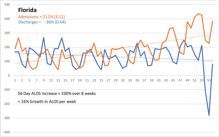 After 5/6, the same formulaic principle is utilized, factoring reported cases against hospital admissions – so that an increase in hospitalization admissions can manifest in the case arrival data and not allow the increase in testing alone, to falsely mask or hide a regional surge or outbreak (as did occur in south border counties during the July time frame). Admissions were estimated using state reported daily hospital census, factored by Hospital Dwell Time (see its entry in this lexicon). The following formula encompasses both of these factoring principles after 5/6.